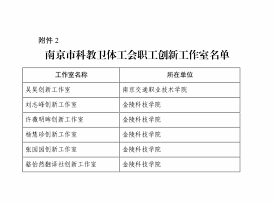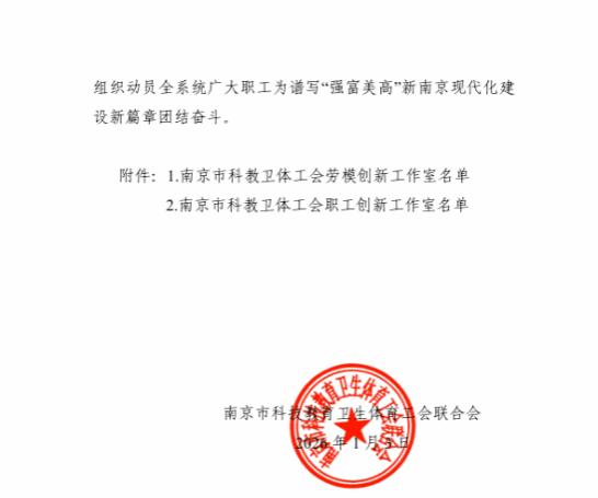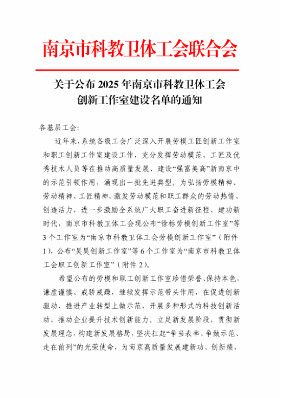 近日,南京市科技教育卫生体育工会联合会发布2025年南京市科教卫体工会创新工作室建设名单,张园园创新工作室成功入选。