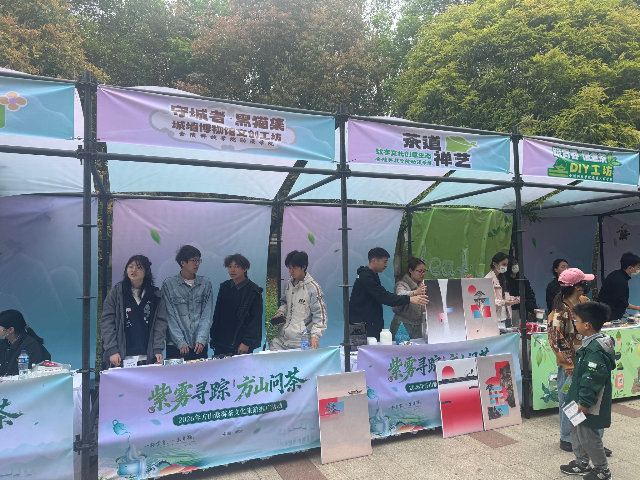 4月11日,“紫雾寻踪 方山问茶”——2026年江宁方山紫雾茶文化旅游推广活动在方山风景区举行。动漫学院组织动画专业城墙博物馆文创工坊、视觉传达设计专业3D打印工坊、数字媒体艺术专业数字赋能乡村工坊参加“方山有好市”市集活动,展示校地融合实践成果。