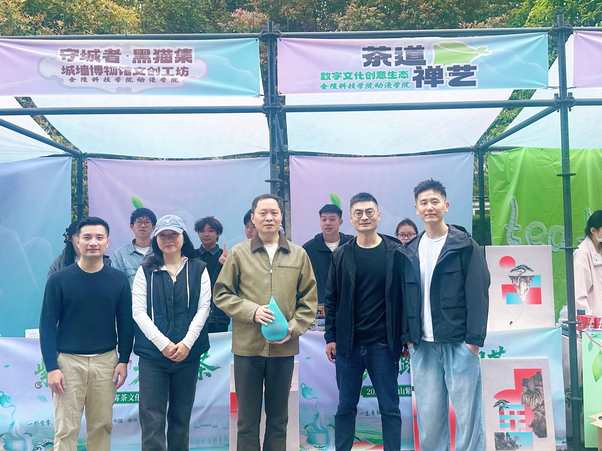 活动中,动画文创工坊以南京城墙文化为灵感,打造了“黑猫”系列IP文创产品,并通过AR互动技术,让观众沉浸式感受南京城墙的深厚文化底蕴;视觉传达设计专业3D打印工坊运用参数化建模与3D打印技术,设计制作了以茶叶、山峦为造型的现代茶具,并现场演示打印过程,吸引众多游客驻足互动;数字媒体艺术专业数字赋能乡村工坊则推出了“杨柳记忆”NFC数字照片,为游客留存出游的数字记忆,同时展示了自主开发的“杨柳依依”小程序,以数字技术赋能乡村茶文旅发展。