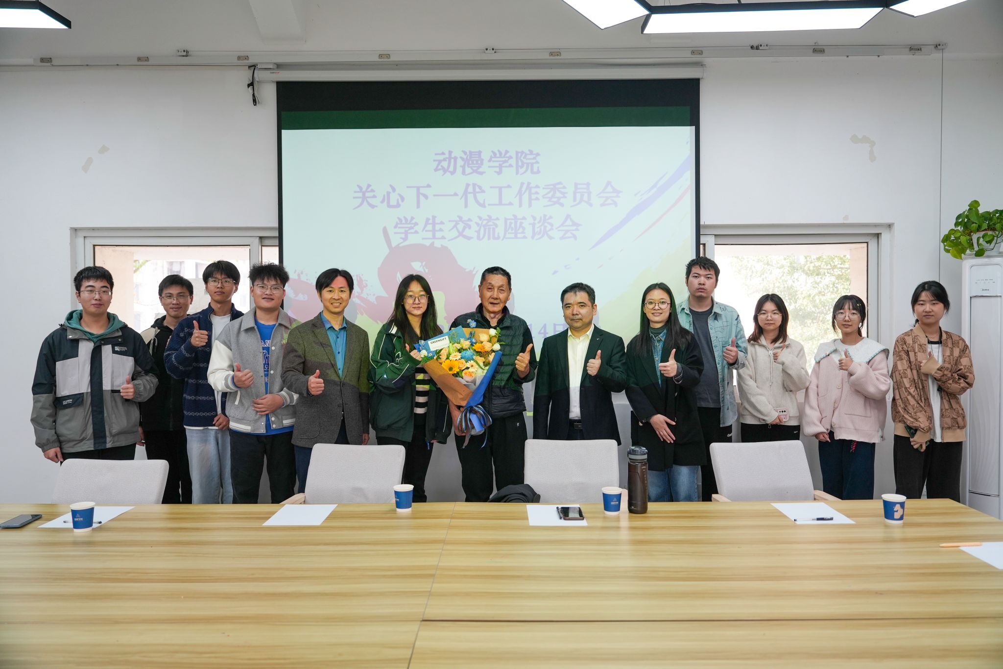 毕鸣仁教授在参观过程中频频驻足,对学生将传统廉洁典故与现代动漫语言相融合的创意呈现给予高度评价,希望同学们以画笔守初心,用青春扬清风。观展结束后,毕鸣仁教授移步南区01栋一站式学生社区,同学生开展交流座谈。会上,学生代表为毕教授献上鲜花,并围绕“廉洁文化如何融入专业学习”畅所欲言,现场气氛热烈。毕教授结合自身四十年从教经历,教导同学们要坚持“一笔一画皆风骨,一言一行见精神”的创作信条,呼吁大家把廉洁当成立业之本,把作品当成人生名片,让清风正气成为动漫人最鲜明的底色。